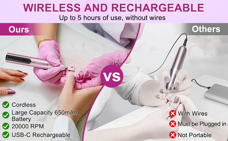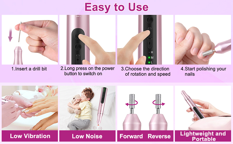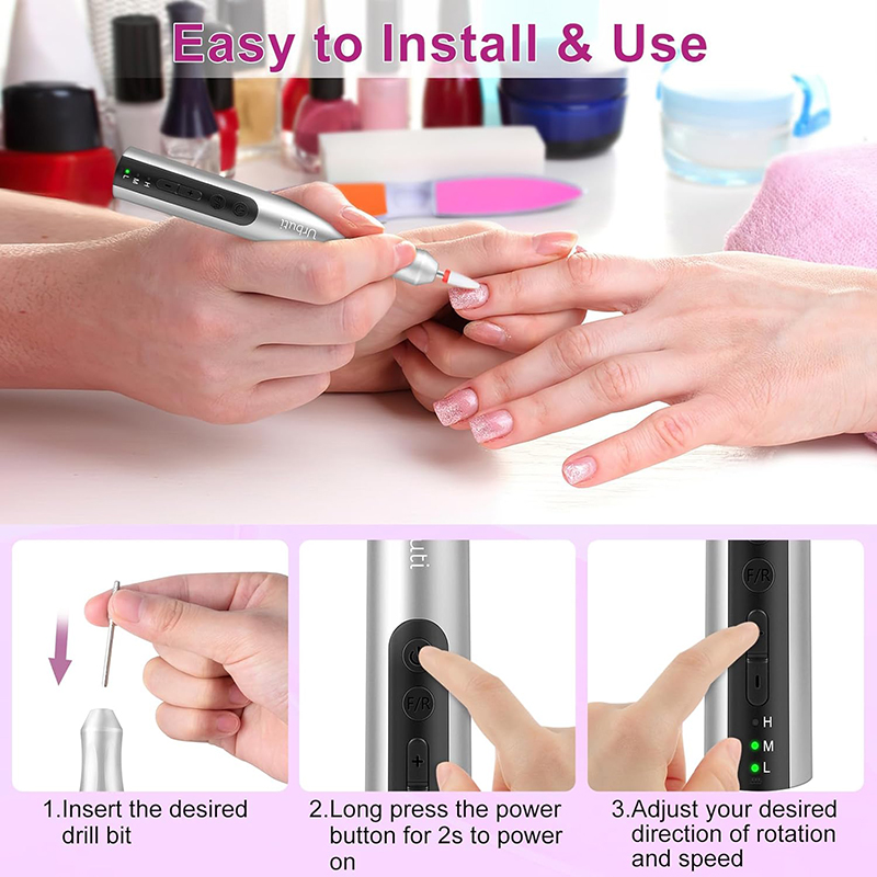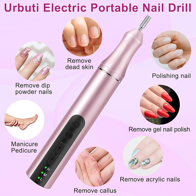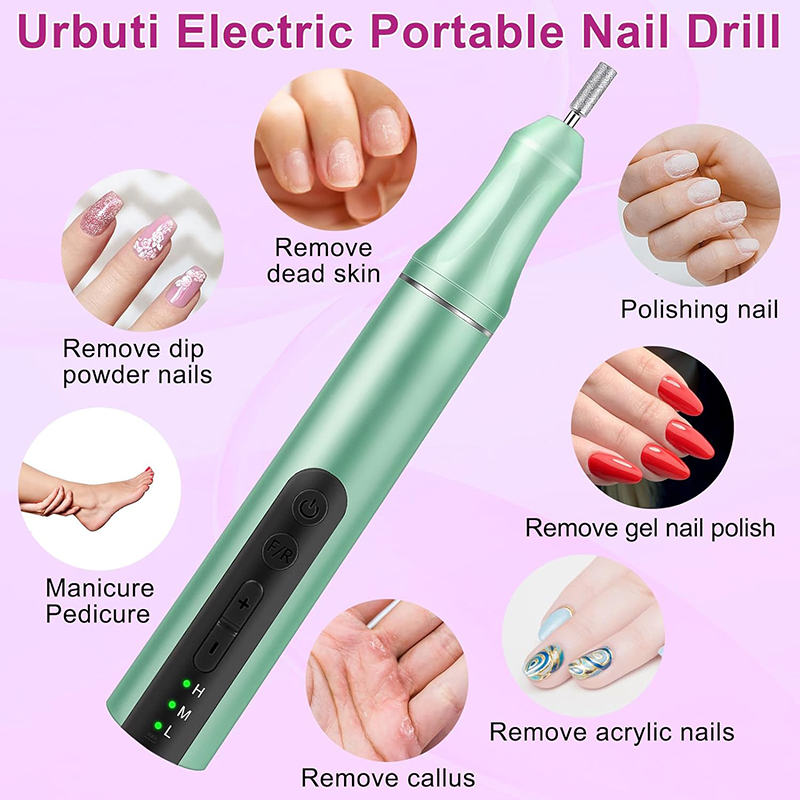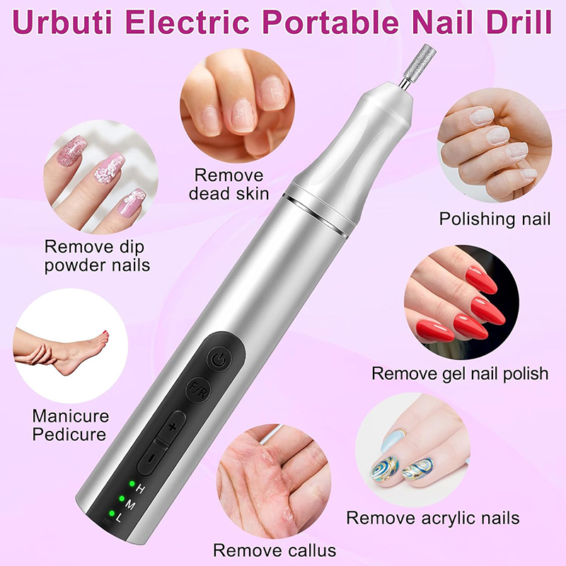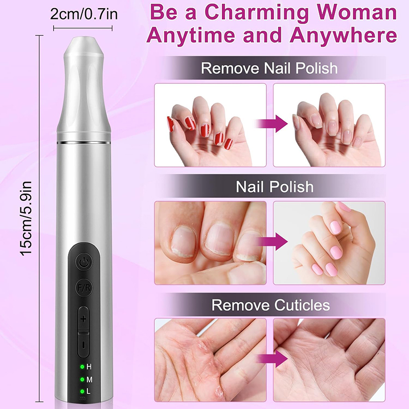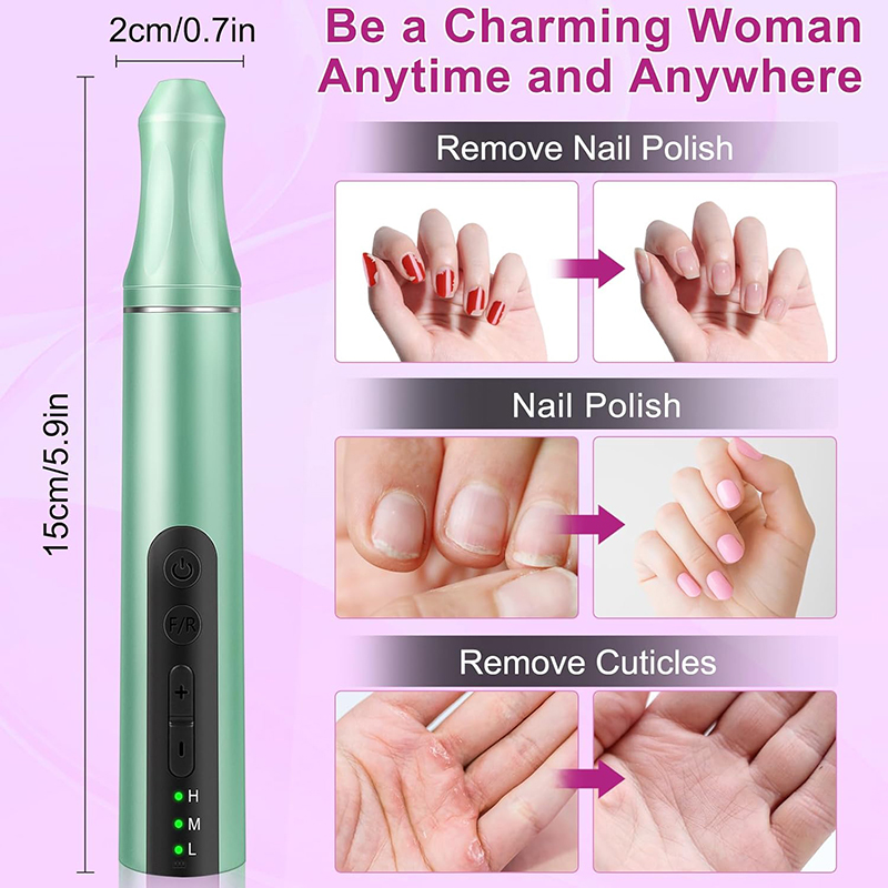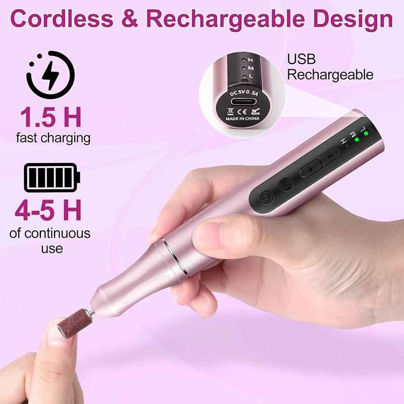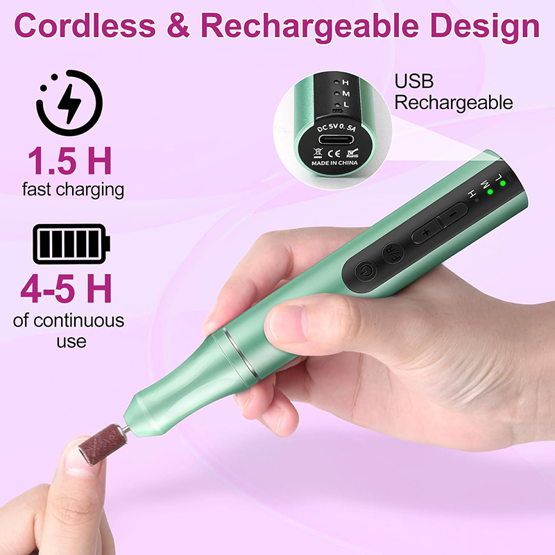 nagų grąžtai akriliniams nagams sukurti taip, kad būtų lengvi (85 g) ir tilptų į piniginę ar drabužių kišenę. Jame taip pat yra USB įkrovimo laidas, kurį galima lengvai prijungti prie bet kurio USB įrenginio, kad galėtumėte įkrauti, todėl galėsite mėgautis nagų priežiūra bet kada ir bet kur.