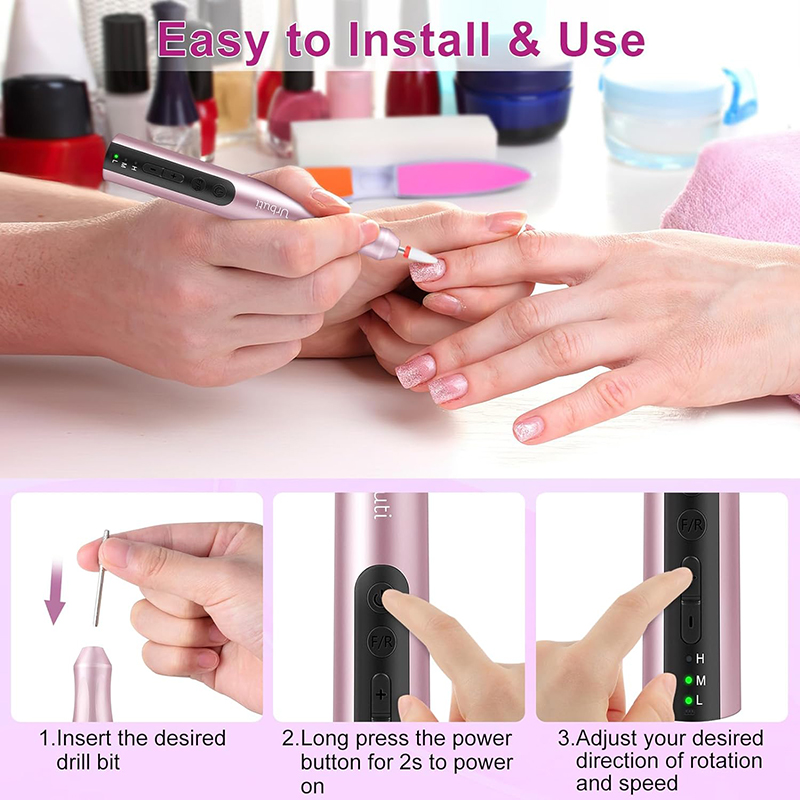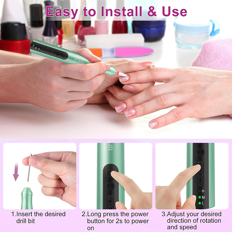 Akumuliatoriniame nagų gręžimo rinkinyje yra daug abrazyvinių juostų ir įvairių grąžtų, kad būtų galima pasirinkti tinkamą įvairių tipų nagams. Norėdami pakeisti grąžtą, tiesiog ištraukite jį, pakeiskite norimu grąžtu ir paspauskite įjungimo/išjungimo mygtuką, kad jį naudotumėte, todėl tai bus ideali dovana savo draugams. Jei turite klausimų apie šį produktą, nedvejodami susisiekite su mumis.