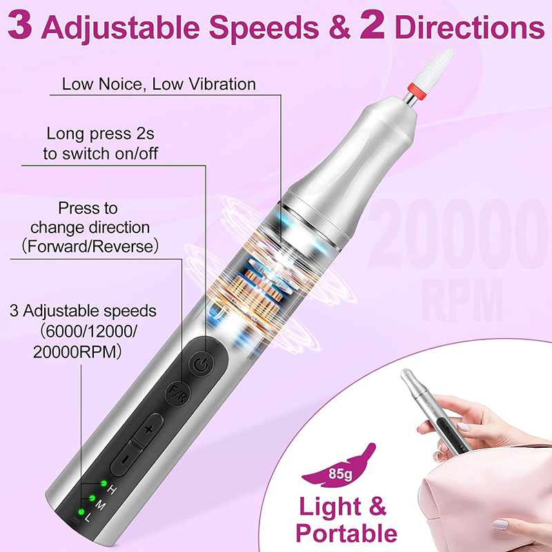Nagų dildymo profesionalas sukurtas su 3 6000-12000-20000 greičiais, tiesiog trumpai paspauskite + arba - mygtuką, kad padidintumėte arba sumažintumėte greitį. Lengva reguliuoti greitį ir sutaupyti laiko galandant nagus. Grąžto kryptį galima lengvai pakeisti paspaudus F/R mygtuką, idealiai tinka kairiarankiams, nagų meistrams ar pradedantiesiems nagų priežiūros srityje.