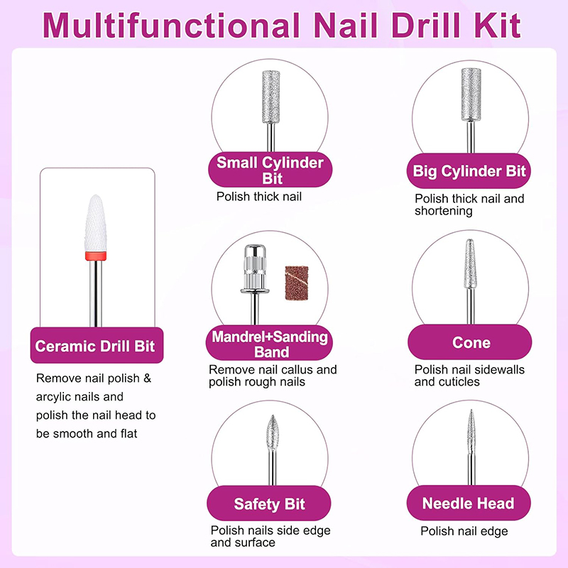 Nagų gręžimo mašiną sudaro 6 nerūdijančio plieno vinių grąžtai, 1 keraminis grąžtas ir 36 keičiamos šlifavimo juostos. Manikiūro pedikiūro rinkinys gali būti naudojamas manikiūrui, pedikiūrui, poliravimui, formavimui, odelių šlifavimui, akrilo/gelinio nagų šalinimui ar nagų grožiui. Su priedais ir paprasta naudoti, puikiai tinka pradedantiesiems nagų dailės!