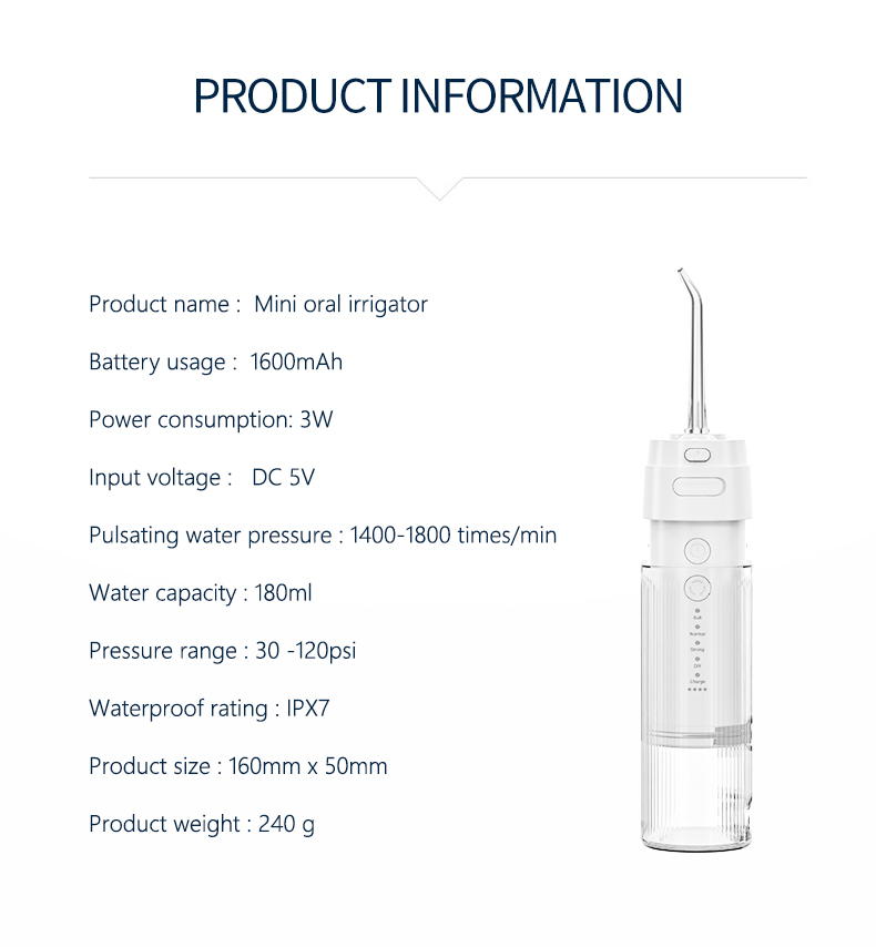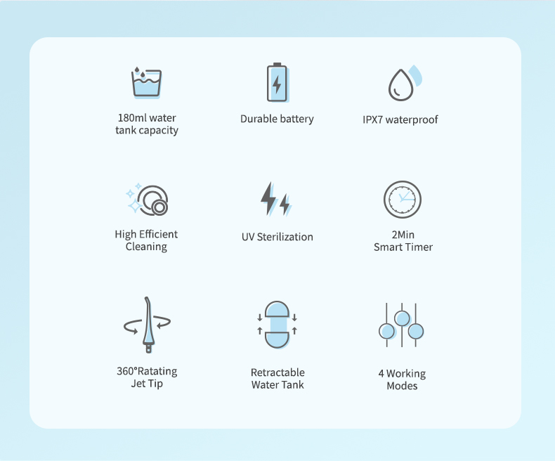 Šis vandens siūlas duoda aukšto vandens slėgio impulsus 1400–1800 kartų per minutę, efektyviai pašalindamas 99,9% dantų apnašų, kad būtų galima išvalyti dantis. Šis vandens siūlas masažuoja dantenas, skatina kraujotaką ir sprendžia burnos problemas, tokias kaip blogas burnos kvapas, ortodontiniai dantys.