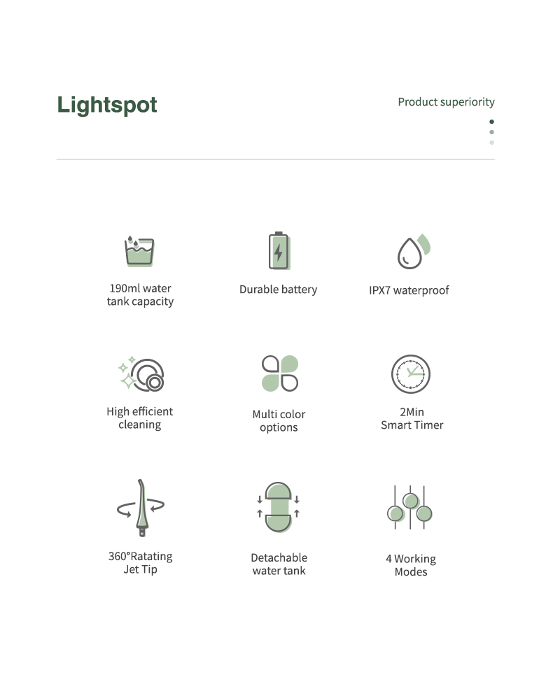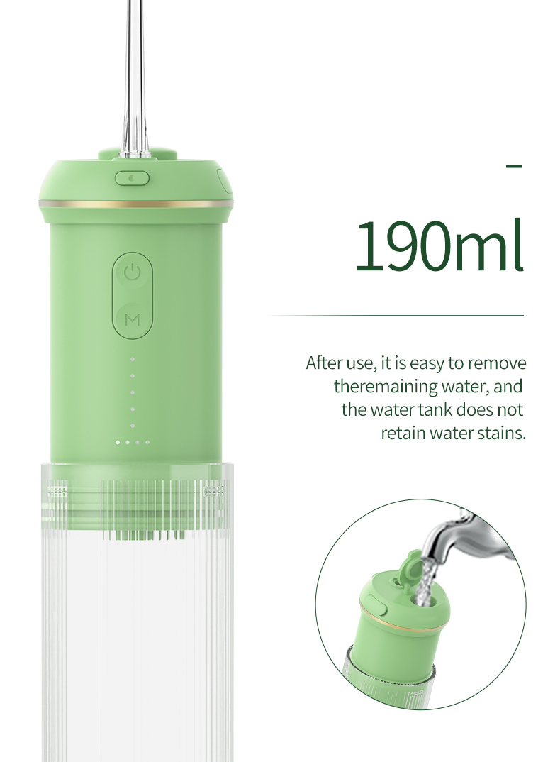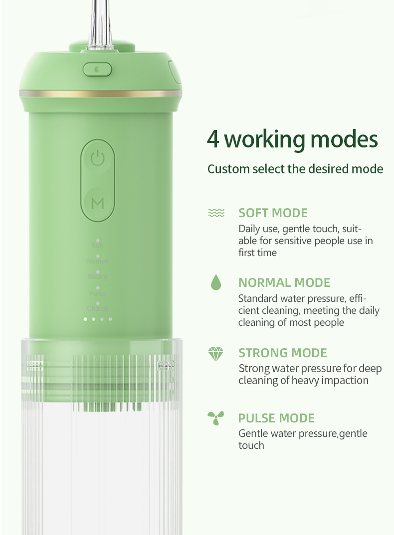 Gilus valymas stipriu slėgiu: Vandens siūlas naudoja naujausią impulsų techniką ir siūlo 4 režimus, kurių slėgio diapazonas yra nuo 30 iki 90 Psi, o pulso dažnis yra 1400-1800 kartų per minutę, kad būtų pasiūlytas didelio intensyvumo vanduo, kuris išvalo 99,99 proc. dantų patempimas, specialiai skirtas periodontitui, breketai.