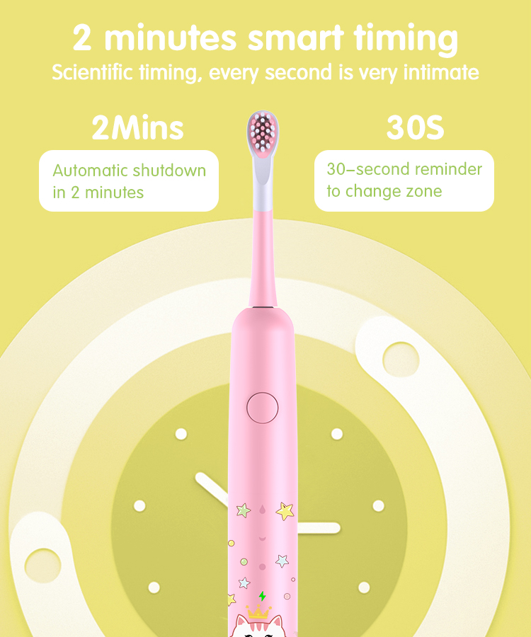 - AUTOMATINIS LAIKMATIS: Šiame elektroniniame dantų šepetėlyje yra įmontuotas 2 minučių trukmės išmanusis laikmatis, kuris skatina vaiką valyti šepetėlį ilgesnį laiką, ugdo gerus dantų valymo įpročius ir mažina dantų ėduonį.