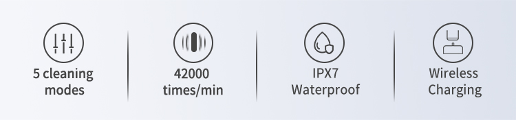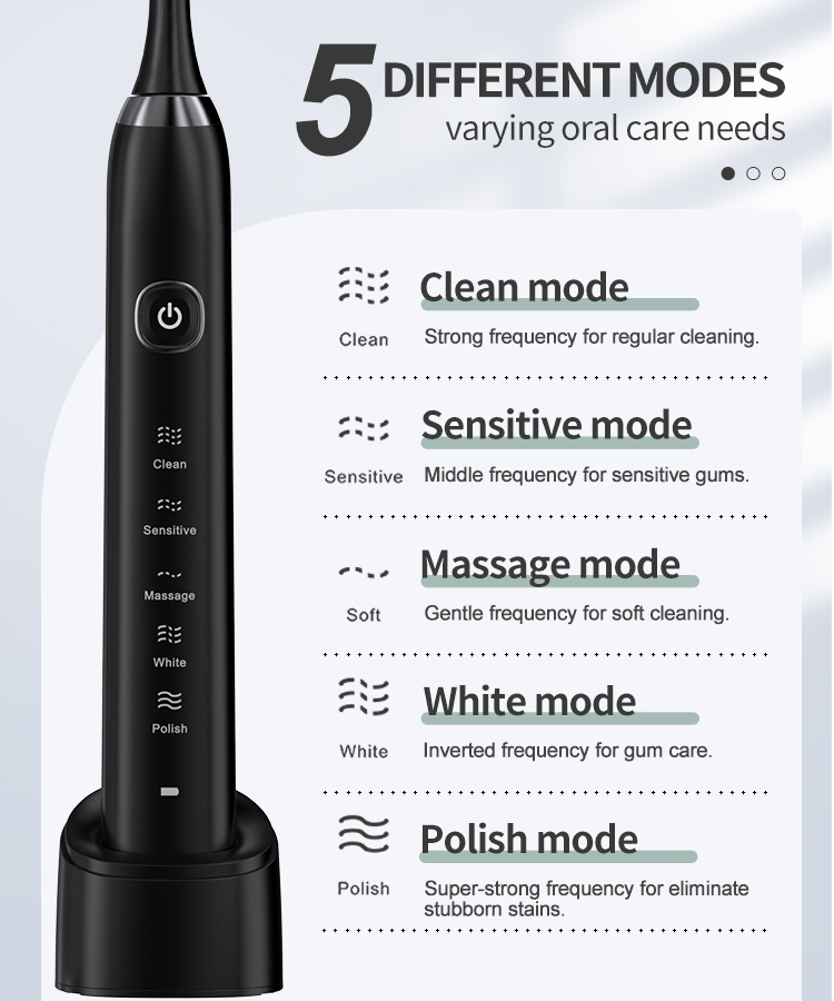 - 5 AUKŠTOS VEIKLOS ŠEITIMO REŽIMAI - Švarus (švelnus), baltas (stiprus), poliravimas (stiprus invertuojamas dažnis), švelnesnis (švelnus invertuojamas dažnis) ir jautrus (minkštas), kad atitiktų įvairias dantenų dantų būklę, todėl galite pasirinkti skirtingus režimus. pagal jūsų pageidavimus ir odontologo rekomendacijas.
