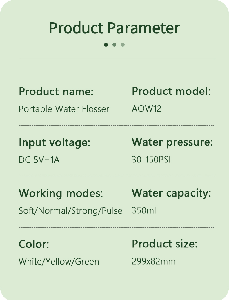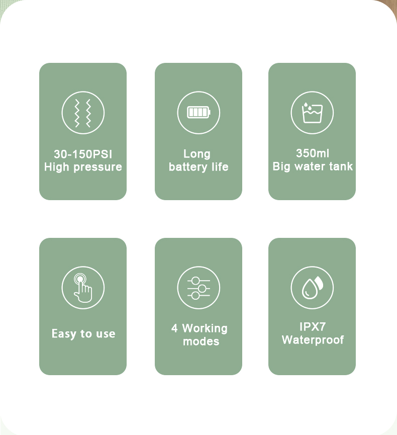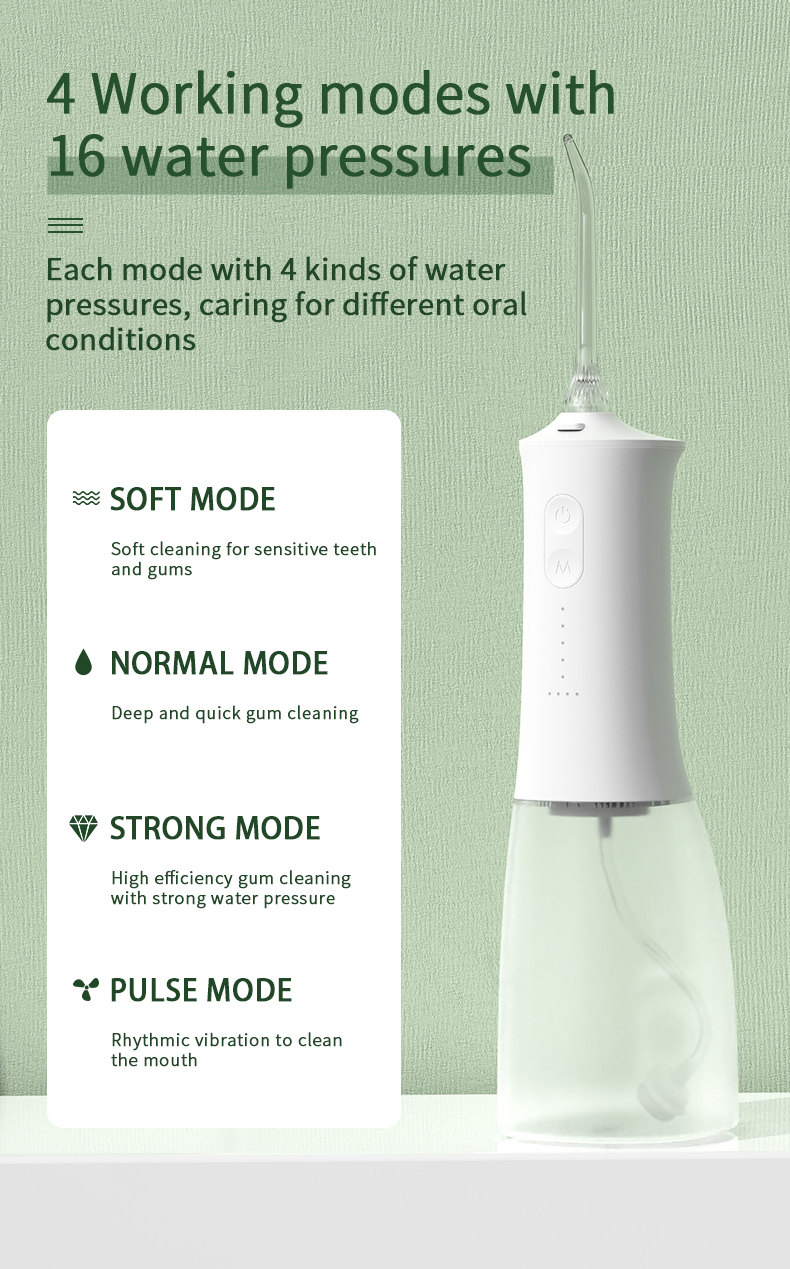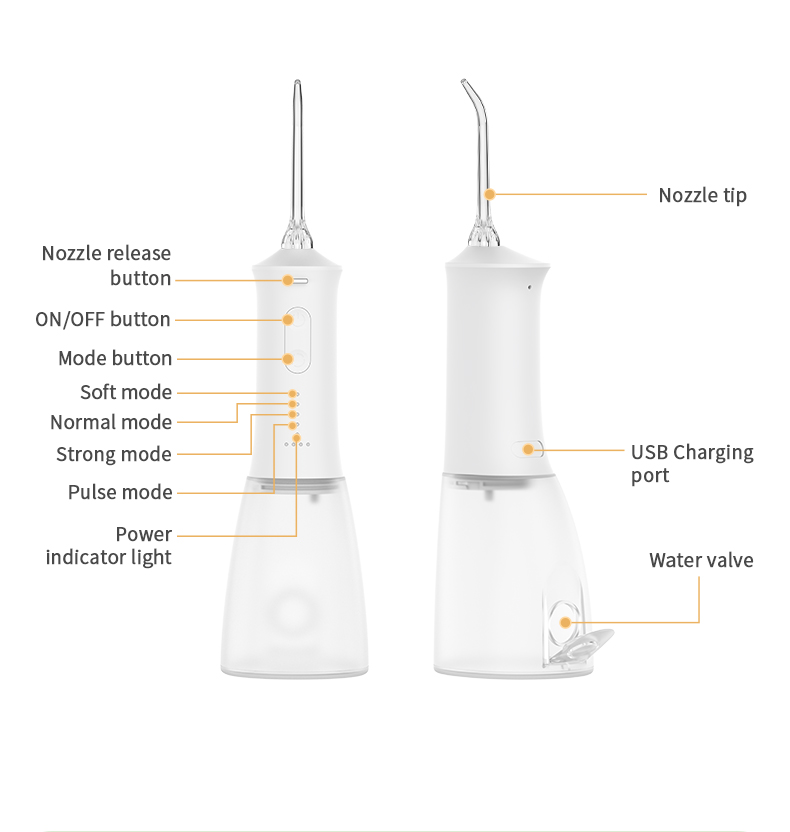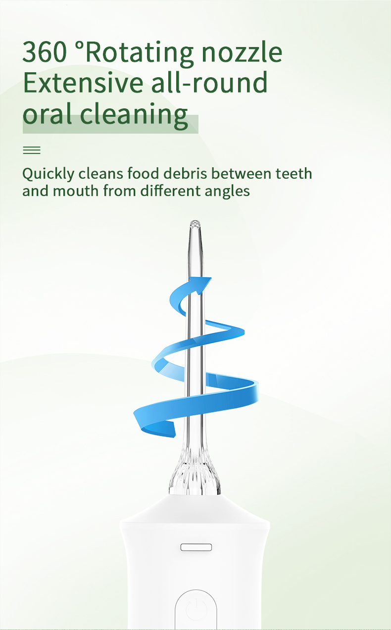 Šis vandens dantų krapštukas duoda aukšto vandens slėgio impulsus 1400–1800 kartų per minutę, efektyviai pašalindamas 99,9% dantų apnašų, kad būtų galima išvalyti dantis. Šis vandens dantų krapštukas masažuoja dantenas, skatina kraujotaką ir sprendžia burnos problemas, tokias kaip blogas burnos kvapas, ortodontiniai dantys.
