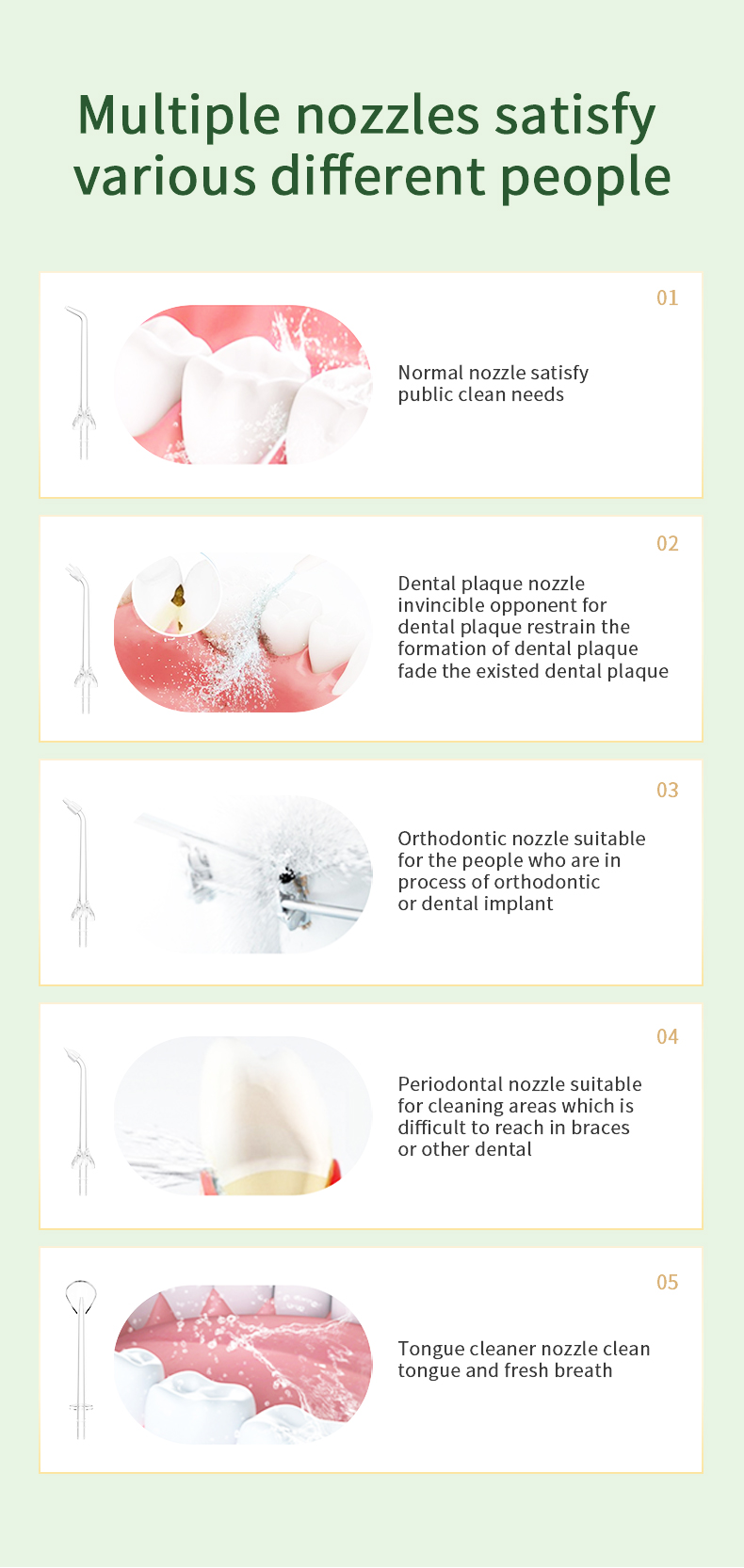 Profesionaliai įvertintas Amerikos odontologų komandos, mūsų siūlas siūlo penkis patogius režimus, atitinkančius skirtingus 99 % skirtingų amžiaus grupių poreikius, tuo pačiu užtikrinant optimalų veikimą ir tarnavimo laiką. Ergonomiška rankena ir 6 keičiami purkštukai užtikrina patogią ir įvairiapusę patirtį. Tai yra apgalvota dovana gimtadienio, Kalėdų Padėkos dienos, Valentino Tėvo Motinos dienos proga arba rūpinantis savo artimųjų burnos sveikata