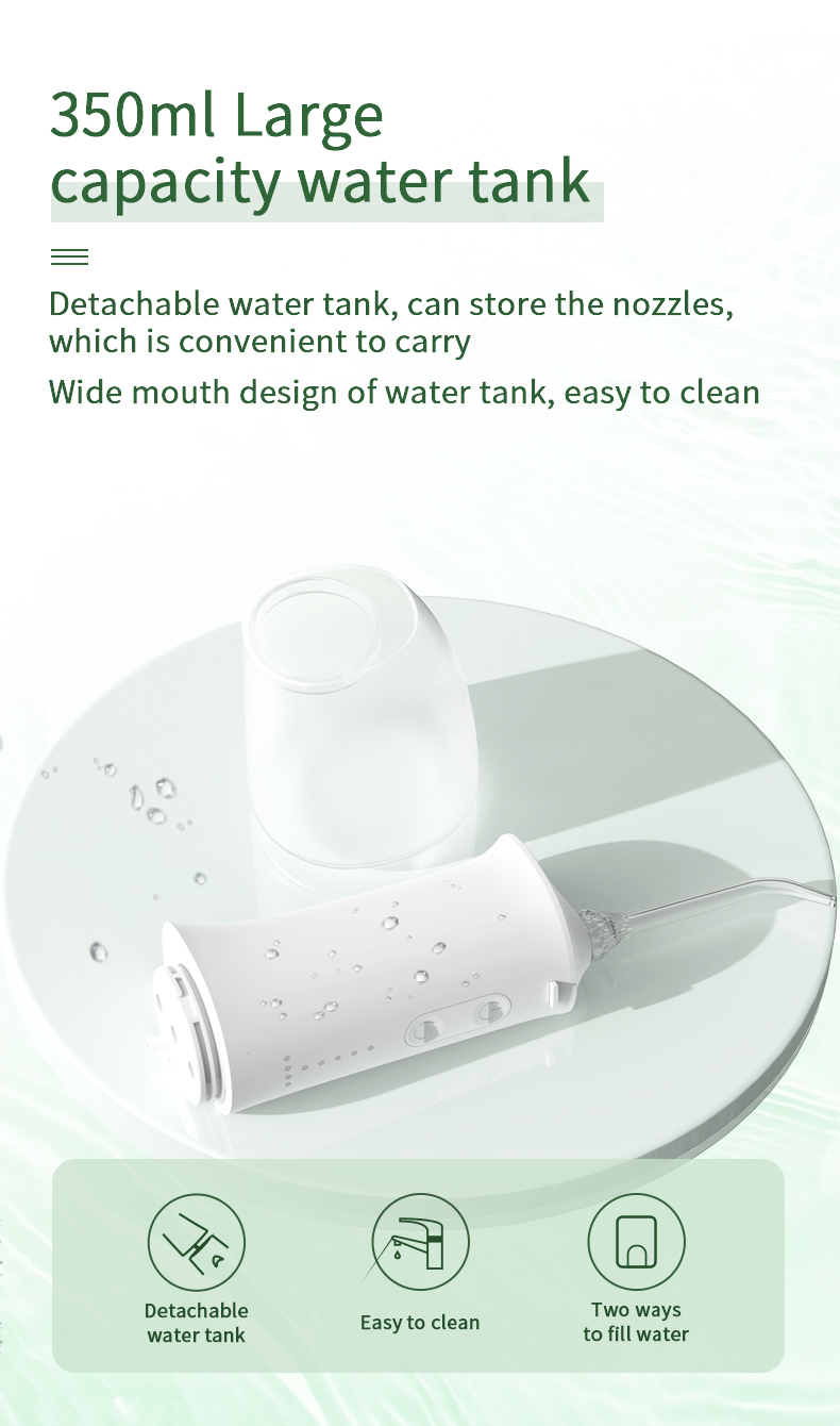 Šis vandens dantų siūlas turi patobulintą 350 ml vandens baką, dvigubai didesnį nei kitų senų modelių, todėl nereikia dažnai pildyti dantų, o burnos valymas tampa patogesnis ir efektyvesnis.