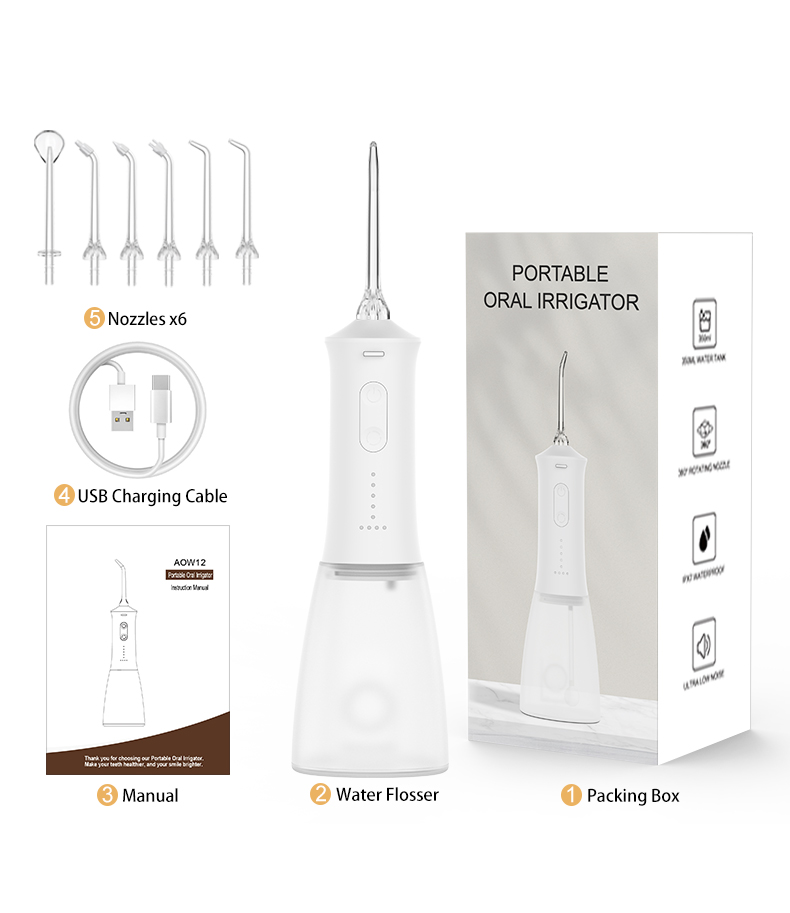 Pakuotė: 1 vnt vandens siūlų korpusas + 5 vnt antgaliai + 1 vnt USB laidas + 1 vnt vartotojo vadovas + 1 vnt dovanų dėžutė.